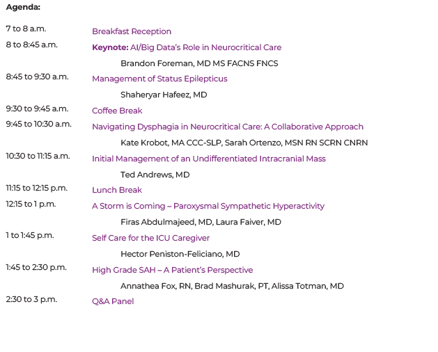 - Reflect on well-being and self-care for the neuro ICU provider.